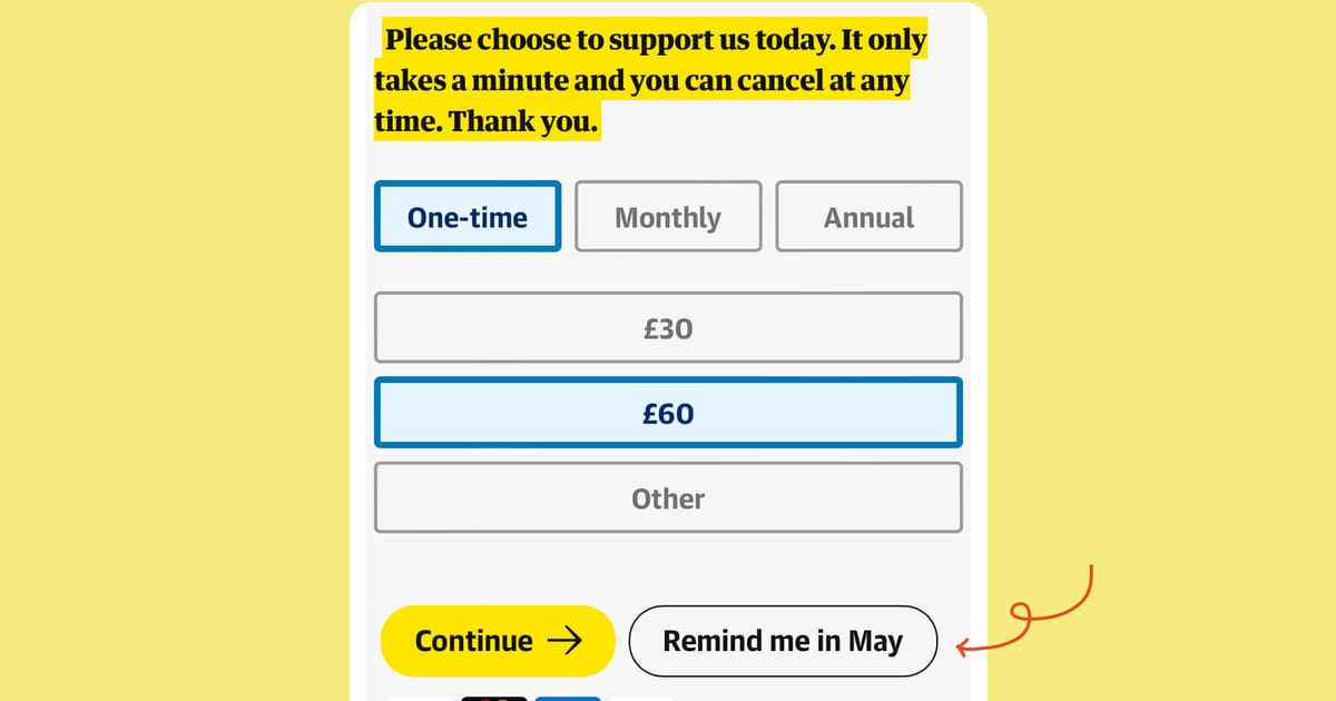 The Guardian have tweaked the UX on their donation ask giving users an option that is between a 'yes' and a 'no' with a new 'Remind me in [next month]' option.
