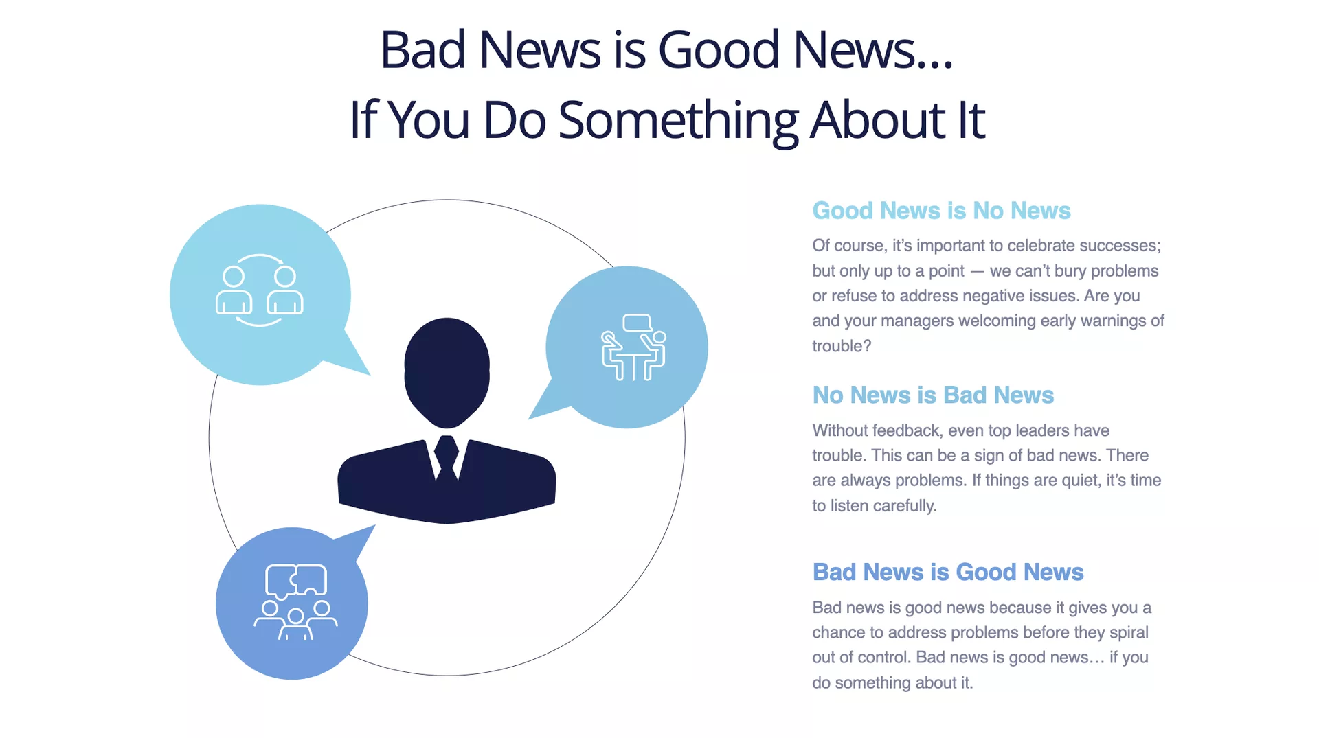 Jim Morgan once said "Good news is no news. No news is bad news. And bad news is good news — if you do something about it."