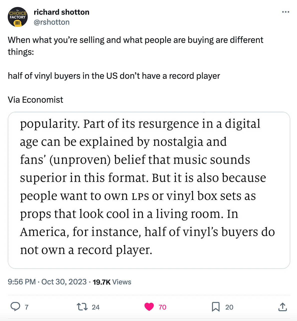 In a recent tweet, Richard Shotton highlighted some 2023 research that showed only 50% of record buyers (in the USA) own a record player.