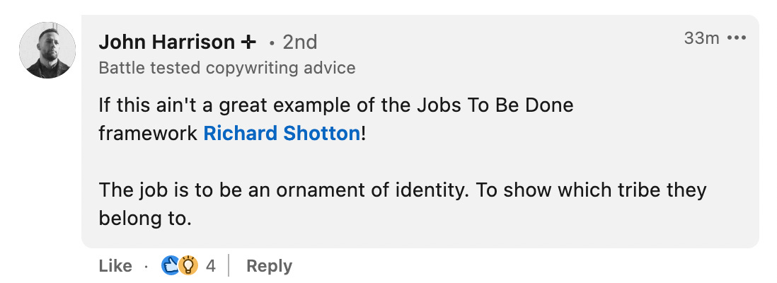 In this comment, John Harrison references the Jobs to be Done (JTBD) framework.